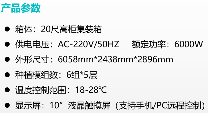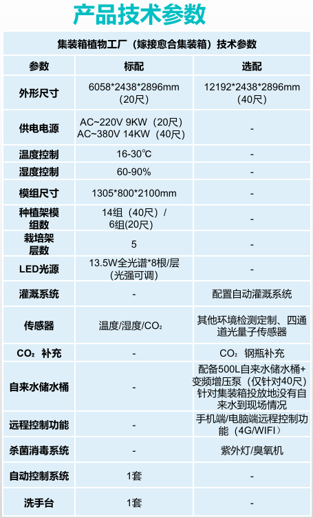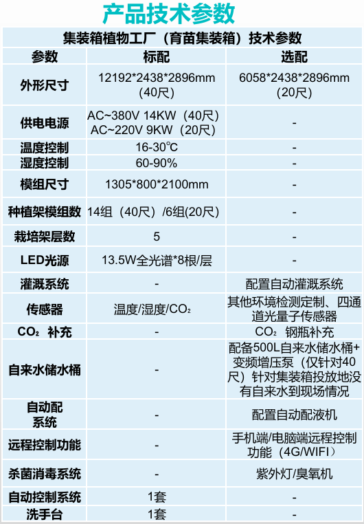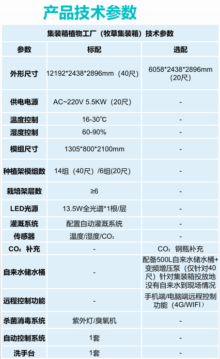 集装箱植物育苗工厂是通过把植物工厂的全套控制及栽培系统集约到集装箱内。把植物工厂安全、高效、精准生产和集装箱移动、灵活、密封完美结合,转运方便,运送至目的地后接入水电,即刻开始运转。设施内高精度环境控制系统,依据育苗阶段对温湿度、光照、水分、二氧化碳浓度、营养成分的需求进行调控,使幼苗在最适宜的环境下生长,是不受外界气候影响的一种新型生产模式。