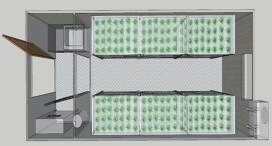 本集装箱式植物工厂采用一体化设计,所有设备整合集中于集装箱内,均固定安装。设备可直接通过挂车运输至客户现场并在短时间内完成吊装固定,只需连接给排水管道并连接电源即可使用。其主要技术优势如下:
