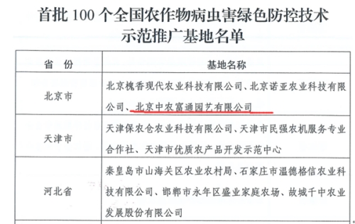 中农富通入选首批100个全国农作物病虫害绿色防控技术示范推广基地