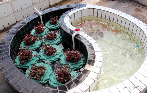 鱼菜共生的作用原理是应用无土栽培模式,把水生植蔬或者陆生植蔬驯化后栽培到无土栽培的基质中,通过种植植蔬的根系对养殖水体中的氮、磷等营养物质进行吸收,利用,转化为自身生长需要的营养物质,并通过植蔬的收获移出系统,经过植物净化后的水体重新输入养殖池内循环利用;主要就是以无土栽培种植的植蔬对养殖水产品养殖水体进行处理,达到养殖用水要求后重新利用,即获得了植蔬,增加了产量,亦处理了养殖水体,无需额外增加养殖设备,减少了投资,改善了水产品的养殖环境,提升了其品质。
