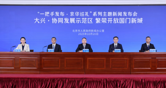 ▲10月20日,北京市人民政府新闻办公室举行“一把手发布·京华巡礼”系列主题新闻发布会——大兴·协同发展示范区 繁荣开放国门新城。大兴区政府主要负责同志带队介绍相关情况并回答记者提问。市委宣传部对外新闻处副处长隗斌主持。