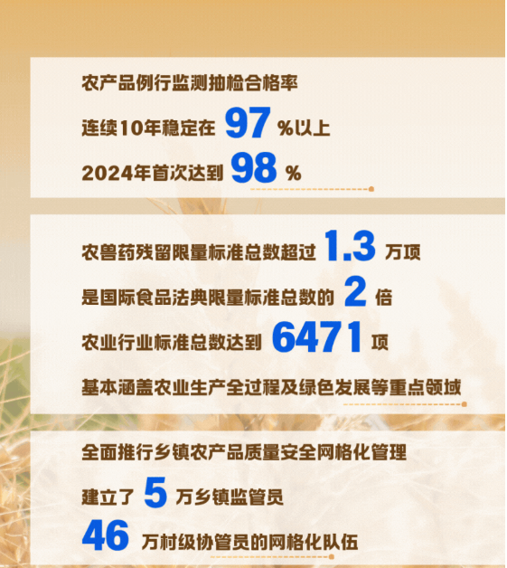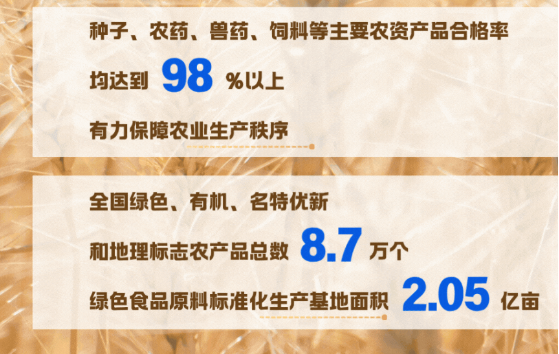 农产品质量安全更是“管”出来的。“严”字当头,才能“安”字兜底。新农安法实施以来,累计查办行刑衔接案件400余件,形成了有力震慑。2024年禁限用药物检出率0.6%,比“十三五”末期降低0.4个百分点;实现主要“菜篮子”产品全覆盖监测,达到“十四五”规划中食用农产品种植养殖环节抽检“2批次/千人”的目标;持续开展农资质量安全专项整治,严打“忽悠团”等制售假劣农资违法行为,种子、农药、兽药、饲料等主要农资产品合格率均达到98%以上,有力保障了农业生产秩序。