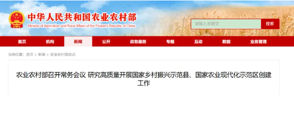 10月10日,农业农村部部长韩俊主持召开部常务会议,审议并原则通过《国家乡村振兴示范县创建工作方案(送审稿)》《国家农业现代化示范区创建工作方案(送审稿)》。